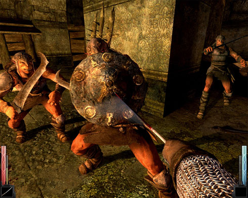 Swrods : Swords are the only weapons used Single Handedly and you are able to wear shield with them, basic Sword has three moves, from right side, left side and up to down, which is almost like oblivion, but the main thing is Charge Attacks, if you click on the Attack button and hold it the character will hold back the sword and launch the attack one you release it, this charge can have several positions, if the sword is up your head(See * Pic), with the lenght of it facing out it's a cutting charge, which can cut the opponents arm or head or foots if you aim directly, the other is Stabbing which with you Stab the opponent, the other is Shield bash which you move shield with Sword who almost always knocks the opponent down. if both you and the opponent both launch a Charge attack and these attacks hit each other this happens :