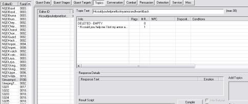 simsarmy Posted August 31, 2006 Author Posted August 31, 2006 :excl: Povuholo :excl: :excl: Earlier:Pic of QuestLater:Pid of Quest :excl: Edit: I can't get the pics to work... :( This is for you to see (Or anyone else who thinks they know what I have done wrong), I already know that both of these sceenshots, are incorrect... I just don't know why. :happy: Seeing as i can't get the pics to work, can anyone tell me where this part comes into the quest creation??? Next thing is the topics. Go to the topics tab. Select the topic greeting (it is probably selected already), and a few greetings should show up. Right click with your mouse on one of the empty fields (at the greetings themselves, not the GREETING topic) and click on new. Type: “Hi, could you help me? I lost my armor, and I want it back.” Select the topic greeting I didnt catch that part, it goes straight from the topic tab, to somthing that I can't see, I thought what you had to do was, press on editor ID, and press new topic, and choose greeting and type new... EDIT: Merged your posts. The edit button is there for a reason, please use it rather than double posting. Thank you. - Switch